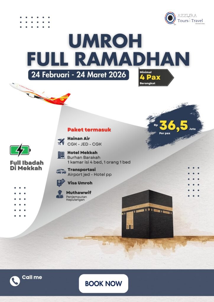 Nikmati perjalanan ibadah yang khusyuk dan nyaman di bulan Ramadhan Azzura Tours & Travel telah menyiapkanΒ paket terbaik full Ramadhan untuk Anda dan keluarga.