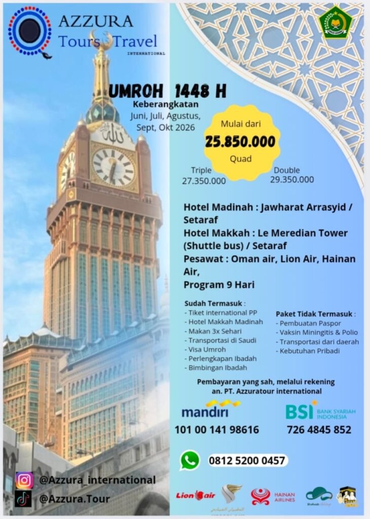 Nikmati perjalanan ibadah yang khusyuk dan nyaman di awal Musim. Azzura Tours & Travel telah menyiapkanΒ paket terbaik untuk Anda dan keluarga.